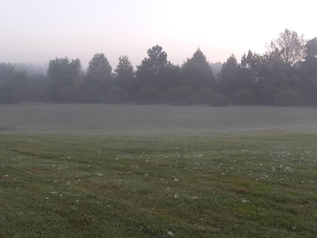 I love fall mornings like this in the land of rolling hills and narrow valleys, when it’s nice and cool and there’s a fog hanging over the land. It’s like living in the clouds. There’s just a hint of the pink sunrise reflecting off the clouds over the trees. I walked barefoot out on to the wet grass to see what was all over the yard. They were tiny little cobwebs that are only visible on foggy mornings that I had completely forgotten all about.