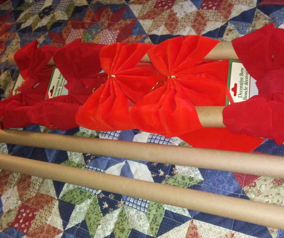 Below is another way to easily store bows. Thread empty wrapping paper tubes through the loops. I cut the tubes down to fit in my tote, but they will fit in the larger totes easily. If you have the room, they could also be slid into large trash bags and then hung up from a hanger.