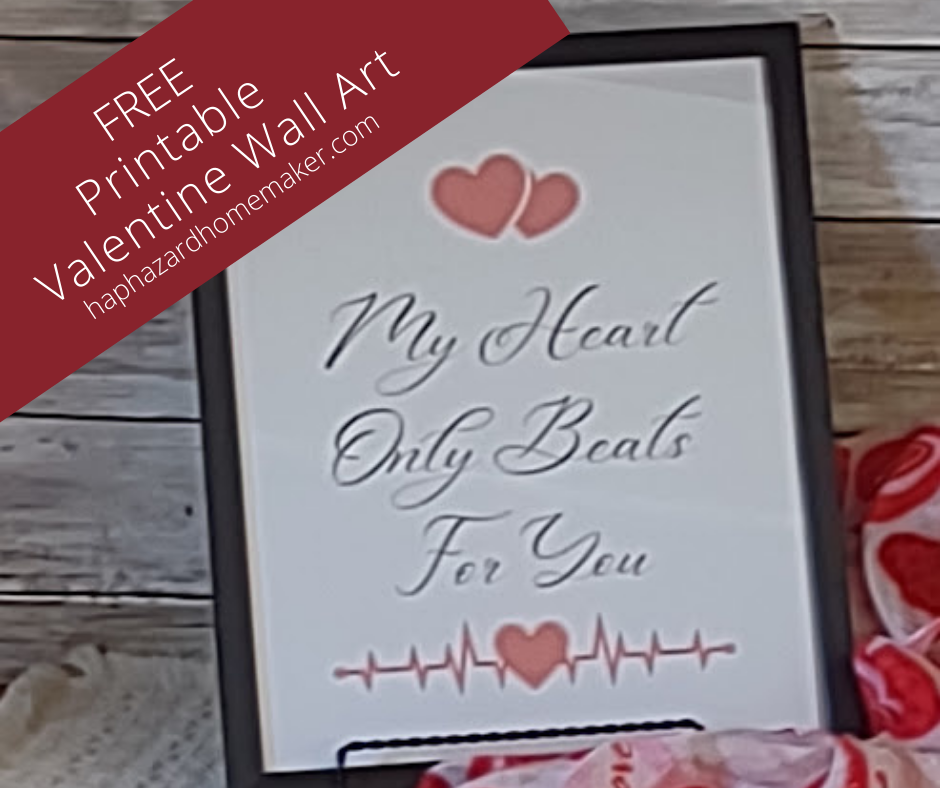 The printable “My Heart Only Beats for You” is a simple design that will fit in any decor scheme. The hearts in the printable below are the actual shade of red. My ink cartridge was running low, but pink is good too.